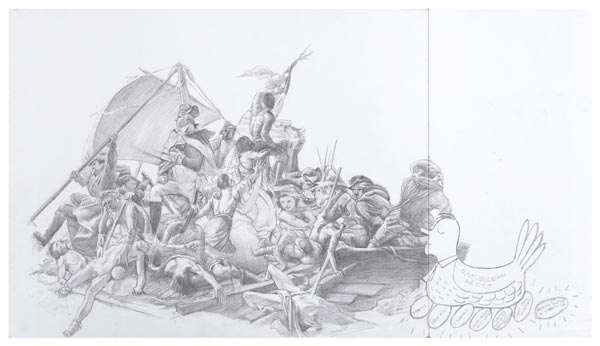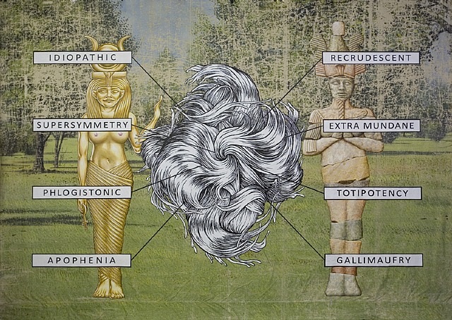 Jim Shaw makes work that is very busy. There are so many cultural references bursting to get out it's like being inside a 1970's American comic. He is incredibly eclectic in what he does ranging from drawings, paintings and installations to thrift store paintings. I found an essay in Frieze which is a good summary of his ideas and interests. His pencil Dream drawings are very detailed (I was in a Vegas show about a Viking farmer...) Also this study for Seven Deadly Sins and a study for Anal/Isis which I read as hair though I may be wrong?
